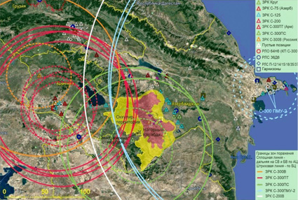 (На рисунке размещение средств ПВО на начало военного конфликта в Нагорном Карабахе) Армения, в последние годы закупкой БПЛА не занималась. При этом она сама производит разведывательный БПЛА легкого класса «Крунк», который, однако, не предназначен для решения ударных задач. По состоянию на начало конфликта, на вооружении ВС Армении стояли различные системы ПВО советского и российского производства, при этом прикрытие воздушного простран-ства непосредственно над территорией Нагорного Карабаха обеспечивали ЗРК «Оса» и «Стрела» Ранее Армения закупала у России ЗРК «Тор», которые можно было бы эффективно применять против БПЛА, однако на территории Нагорного Карабаха их не размещали. Оба этих ЗРК ориентированы, прежде всего, на поражение самолетов и вертолетов армейской авиации и не предназначены для борьбы с БПЛА. С началом боевых действий в Нагорном Карабахе азербайджанские вооруженные силы, при поддержке турецких военных специалистов, развернули массовое групповое применение ударных БПЛА, с учетом опыта применения БПЛА в Сирии и Ливии. Если бы война в Нагорном Карабахе велась бы без БПЛА, армянские системы ПВО были бы вполне адекватны задачам по сдерживанию азербайджанской авиации. Неслучайно, даже получив превосходство в воздухе, Азербайджан очень ограниченно использует свою пилотируемую авиацию, так как остающиеся на вооружении Армении ЗРК до сих пор представляют для них серьезную угрозу. Однако Армения оказалась совершенно не готова к войне с массовым использованием БПЛА. Результатом массированного применения групп БПЛА Bayraktar TB2, совместно с «БПЛА-камикадзе» Sky Striker, Harop и Orbiter стало практически полное уничтожение армянских ЗРК «Оса» и «Стрела-10», размещенных в Нагорном Карабахе. Уже в первый день войны по позициям этих ЗРК был нанесен заранее подготовленный удар, который лишил оборону Нагорного Карабаха, по оценкам специалистов, до 80% комплексов ПВО – 6 ЗРК «Оса» и 3 ЗРК «Стрела-10» при потерях в 4 БПЛА. Таким образом, за счет массовости и внезапности применения, обеспечив размен 2,25 ЗРК на 1 БПЛА (!), завоевание превосходства в воздухе дало возможность Азербайджану с помощью БПЛА непрерывно, в круглосуточном режиме, и беспрепятственно атаковать армянские мотострелковые и механизированные части, нанося им существенные потери еще до того, как они вступали в бой с силами Азербайджана. Это значительно облегчило наступление азербайджанской армии и позволило добиться существенных тактических успехов. При этом, оставшиеся на вооружении Армении комплексы ПВО, такие как С-300ПС и С-300ПТ, в принципе не предназначены для борьбы с БПЛА, в связи с чем они не могут быть эффективно использованы для обороны воздушного пространства Армении и Нагорного Карабаха от этого нового типа угроз. Более того, в результате грамотно спланированной операции силами БПЛА были уничтожены 2 пусковые установки и 2 РЛС из состава ЗРК С-300ПС. Один из уничтоженных ЗРК С-300ПС входил в состав системы ПВО Армении и находился на открытой местности без какого-либо дополнительного прикрытия. Причиной тому послужило то, что на первом этапе военного конфликта Азербайджан использовал самолеты Ан-2 в беспилотном исполнении, чтобы выявить местоположение армянских систем ПВО. Самолеты были сбиты, но это позволило вскрыть местоположение как ЗРК С-300ПС, так и ЗРК бли